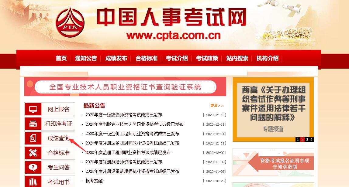 成绩查询官网:中国人事考试网(http://www.cpta.com.cn/)