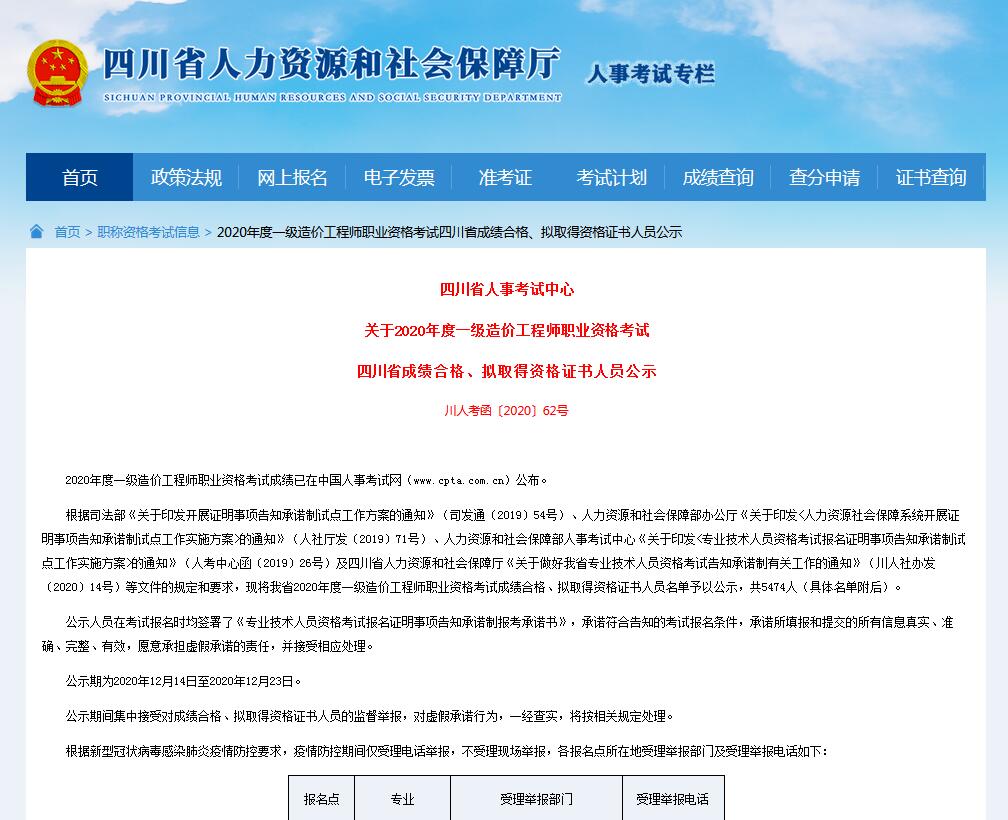 2020年12月19日 来源:来学网近日四川省人事考试中心发布了《四川省2020年度一级造价工程师职业资格考试成绩合格、拟取得资格证书人员公示》,一级造价工程师考试成绩已经在中国人事网公布,四川会对一级造价工程师合格人员名单进行公示,文章详情如下:
