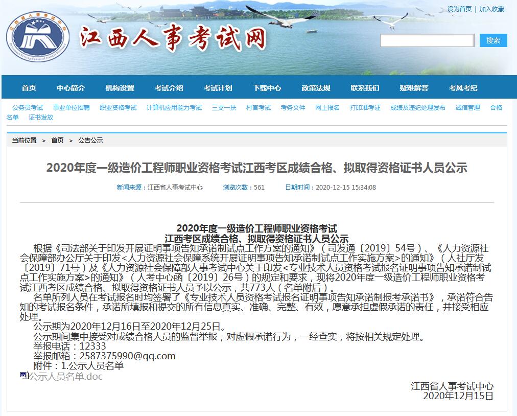 江西2020一级造价工程师考试成绩合格人员名单查看!!