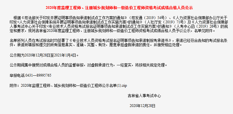 2020年12月30日 来源:来学网吉林人事考试网发布了《2020年度监理工程师、注册城乡规划师和一级造价工程师资格考试成绩合格人员公示》,小编查看了名单合格人数有967人,文章详情如下: