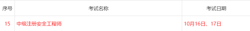 根据“人事考试中心2021年中级安全工程师考试计划表”可知2021年中级注册安全工程师考试时间是10月16日、17日。考试时间科目题型详情如下: