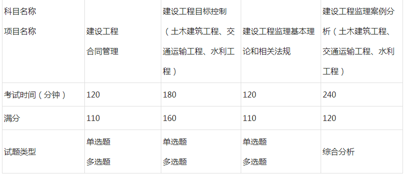 《建设工程监理基本理论和相关法规》和《建设工程合同管理》为基础科目;《建设工程目标控制》和《建设工程监理案例分析》为专业科目。专业类别分为土木建筑工程、交通运输工程和水利工程,报考人员可根据实际工作需要选报其一。