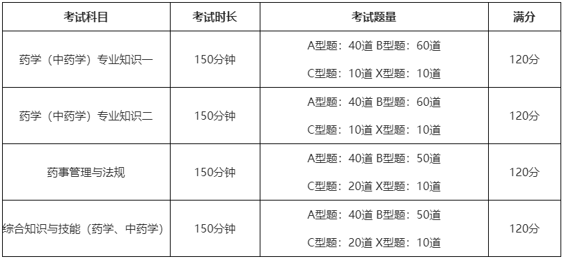 考试时长为150分钟,分为中药学和药学两类考试,每类考试设4个科目,其中《药事管理与法规》是两类考试的共考科目。从事中药学或药学专业工作的人员,可根据从事的专业工作,选择中药学类或药学类的考试。