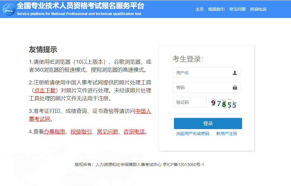 1.注册用户。首次报考人员应在报名前完成用户注册,己注册的报考人员不需重新注册,但报名前应提前登录网上报名系统补充完善相关信息。网上报名系统通过政务信息共享接口等方式对报考人员身份、学历学位等信息进行在线核查。完成相关数据核查后方可继续报名。建议报考人员在报名前预留充足时间提前完成用户注册或信息维护。如忘记注册用户名和密码,可通过报名平台页面“用户名或密码找回”功能找回用户名重新设置密码或联系当地人事考试管理机构。