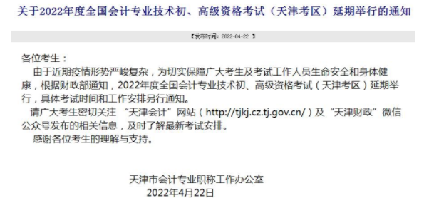 天津2022年初级会计师考试延期举行通知