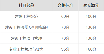 一级建造师考试科目有《建筑工程经济》、《建设工程法规及相关知识》、《建设工程项目管理》、《专业工程管理与实务》4个科目,各科合格分数及标准为试卷满分的60%。即: