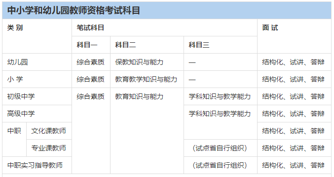 注2:幼儿园面试不分科目,小学面试科目分语文、数学、英语、道德与法治、科学、音乐、体育、美术、心理健康教育、信息技术;中学面试科目与科目三相一致。