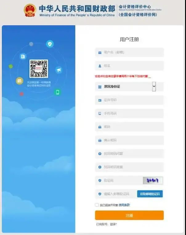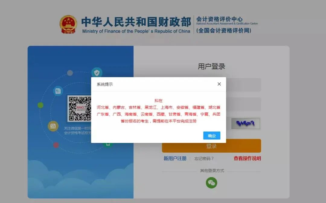 登录:考生通过点击全国会计资格评价网(http://kzp.mof.gov.cn/)右上方的登录链接,进入登录页面,根据提示输入用户名、密码以及验证码,点击"登录"按钮进入系统首页。也可使用本人微信扫码登录,如下图所示。