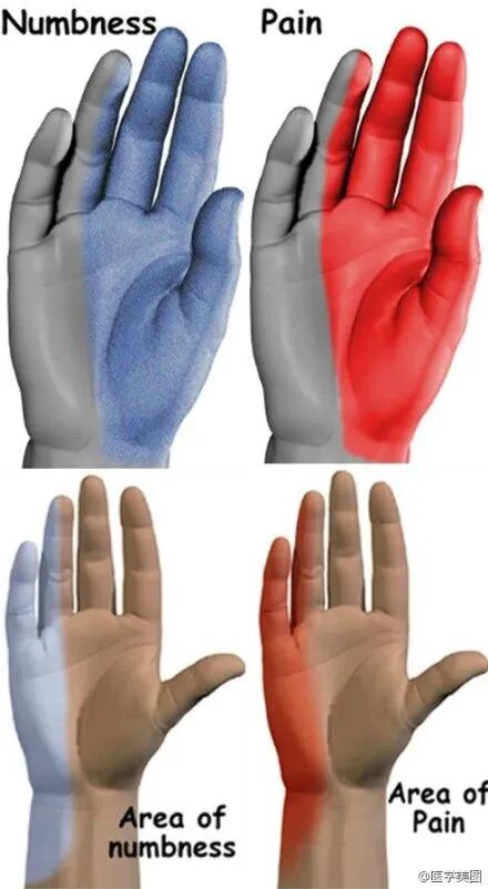 (1)手掌:正中神经支配拇指、示指、中指及无名指的一半区域,剩下的一指半由尺神经支配;