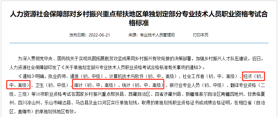 早前,人社部发布了《人力资源社会保障部对乡村振兴重点帮扶地区单独划定部分专业技术人员职业资格考试合格标准》,其中指出:经济师、审计师、统计师等考试可以在部分地区实行单独划线,划线标准会低于全国统一的合格标准。