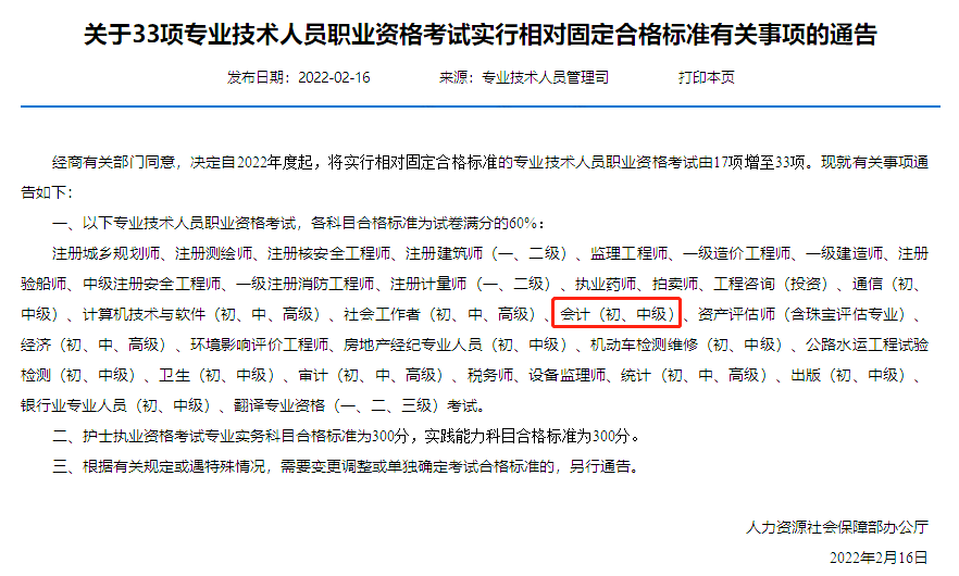 关于初级会计考试合格标准的问题,早前人社部同样也有明确的说明。人社部发布的《关于33项专业技术人员职业资格考试实行相对固定合格标准有关事项的通告》,明确了初级会计考试实行相对固定合格标准。各科目合格标准为试卷满分的60%。