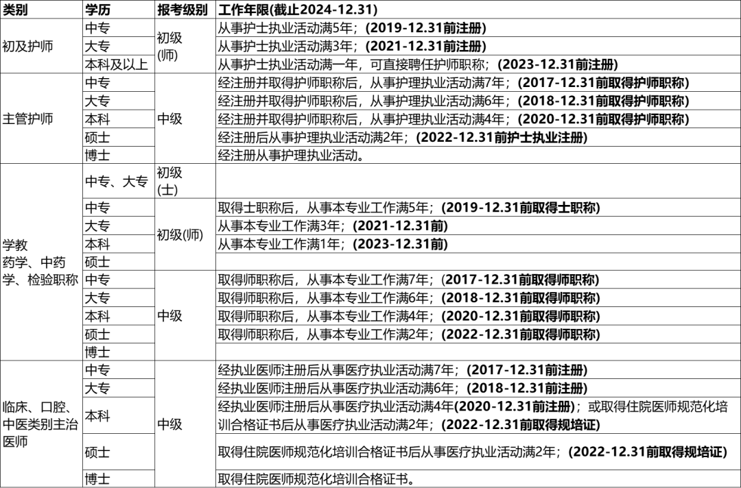 卫生专业技术人员中级职称实行全国统一考试制度。具有相应专业学历并符合下列条件的,可以报名参加考试: