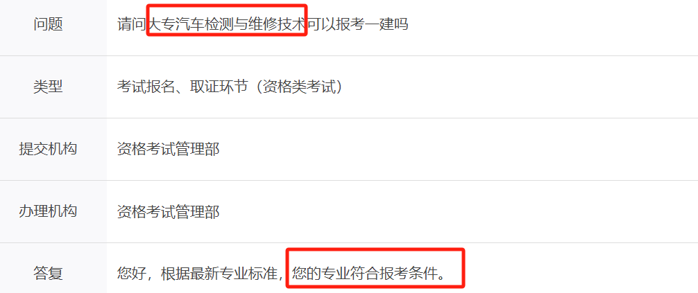 问题:请问大专汽车检测与维修技术可以报考一建吗