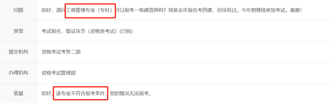 问题:你好,工商管理专业(专科)可以报考一级建造师吗?我是去年报名考四课,但没有过。今年想继续参加考试。谢谢!
