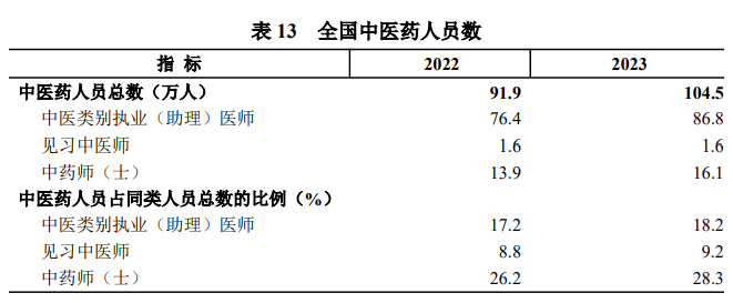 2023年,全国中医药卫生人员总数104.5万人,比上年增加12.6万人(增长13.8%)。其中:中医类别执业(助理)医师86.8万人,中药师(士)16.1万人。两类人员较上年均有所增加。