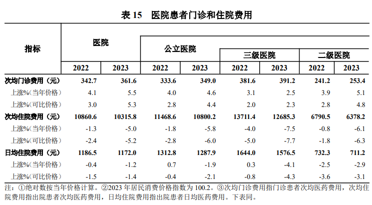 2023年,医院次均门诊费用361.6元,按当年价格比上年上涨5.5%,按可比价格上涨5.3%;次均住院费用 10315.8元,按当年价格比上年下降5.0%,按可比价格下降5.2%。日均住院费用1172.0元。