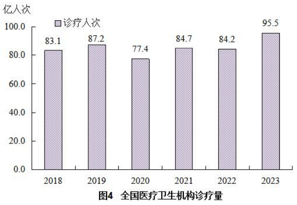 2023年,全国医疗卫生机构总诊疗人次95.5亿,比上年增加11.3亿人次(增长13.5%)。2023年居民平均到医疗卫生机构就诊6.8 次。
