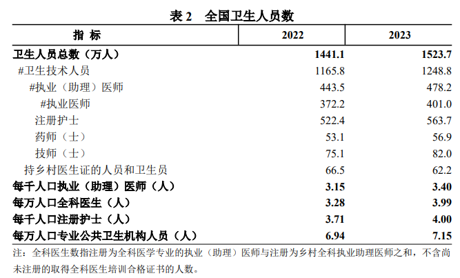 2023年末,全国卫生人员总数1523.7万人,比上年增加82.7万人(增长5.7%)。