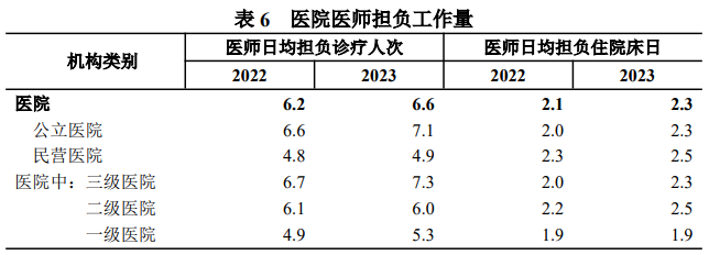 2023年,医院医师日均担负诊疗6.6人次、住院2.3床日,其中:公立医院医师日均担负诊疗7.1人次、住院2.3床日(见表6)。