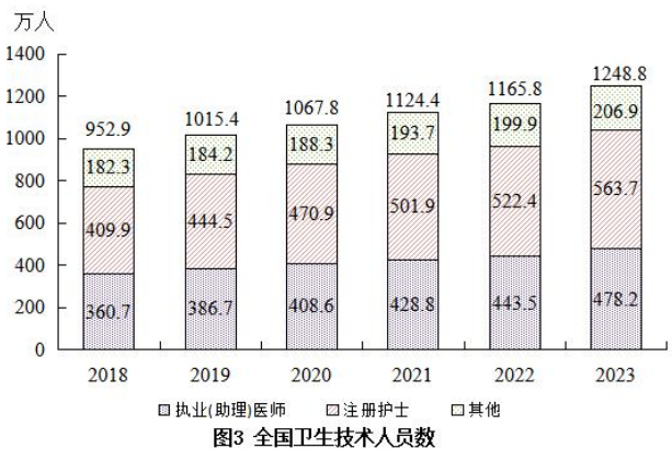 2023年末卫生人员总数中,卫生技术人员1248.8万人。卫生技术人员中,执业(助理)医师478.2万人,注册护士563.7万人。与上年比较,卫生技术人员增加83.0万人(增长 7.1%)(见表 2)。