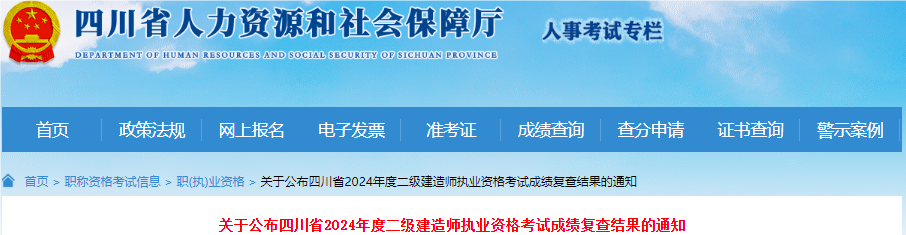 2024年度二级建造师执业资格考试,成绩复查结果现已公布,请各位考生从四川省人力资源和社会保障厅官网“人事考试”专栏进入“查分申请”栏查看复查结果。