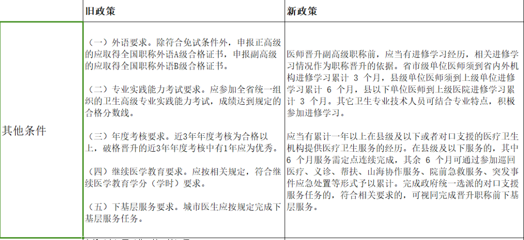 取消旧政策中规定的外语要求,高级职称晋升仍是考评结合,参加评审需通过考试,对进修学习和基层服务做了明确的规定。新政策中要求: