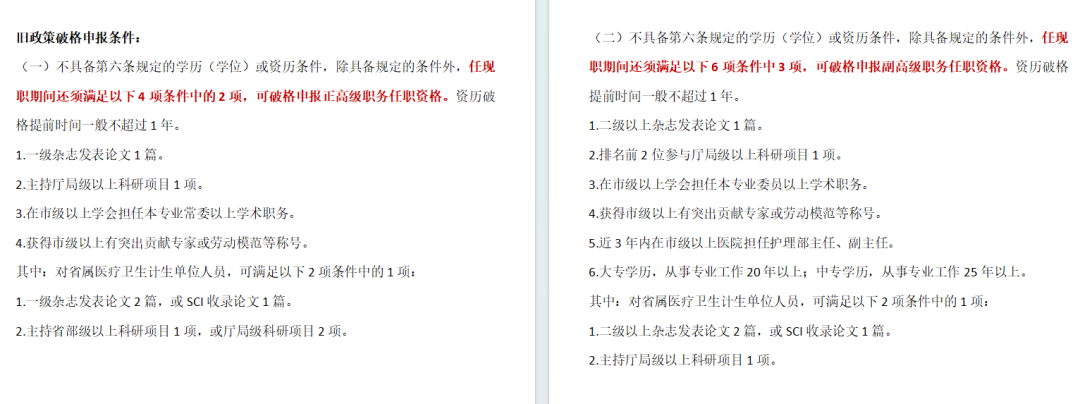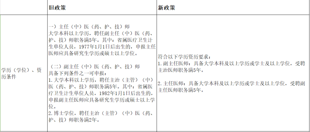 新政策中,不管是晋升正高还是副高,均要求具备大学本科及以上学历或学士及以上学位,受聘相应职务满5年。取消旧政策中的省属医疗卫生计生单位人员限制和博士学位优待。