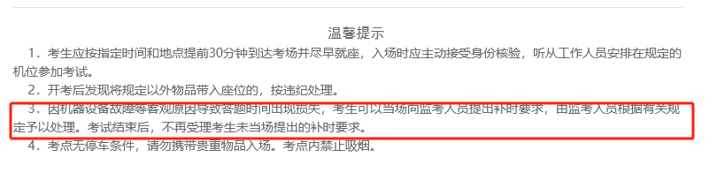 因机器设备故障等客观原因导致管题时间出现损失,考生可以当场问监考人员提出补时要求,由监考人员根据有关规定予以处理。考试结束后,不再受理考生未当场提出的补时要求。