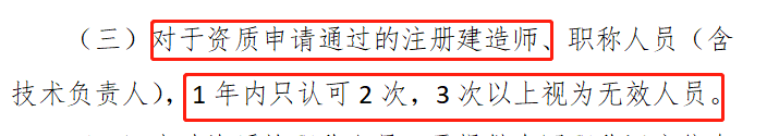对于资质申请通过的注册建造师、职称人员(含技术负责人),1年内只认可2次,3次以上视为无效人员。
