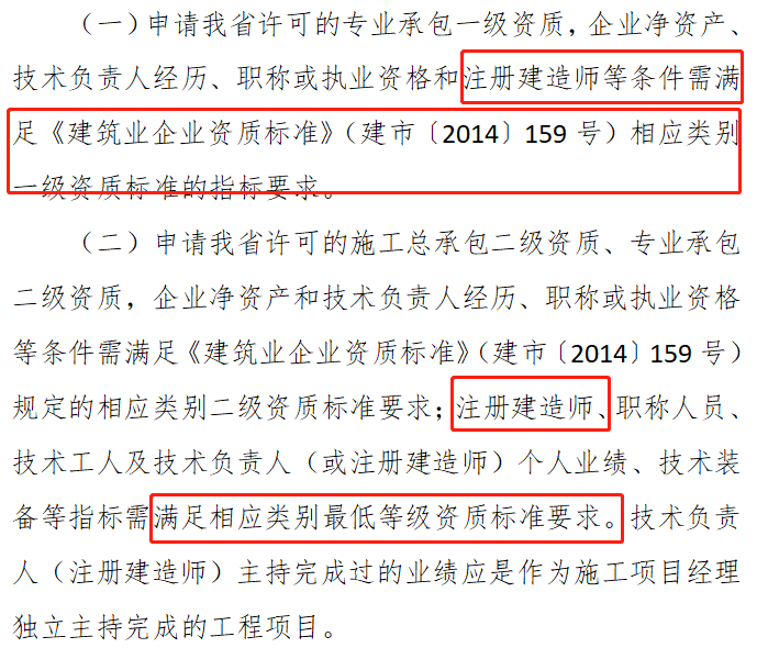 申请我省许可的施工总承包二级资质、专业承包二级资质,企业净资产和技术负责人经历、职称或执业资格等条件需满足《建筑业企业资质标准》(建市〔2014〕159号)规定的相应类别二级资质标准要求;注册建造师、职称人员、技术工人及技术负责人(或注册建造师)个人业绩、技术装备等指标需满足相应类别最低等级资质标准要求。技术负责人(注册建造师)主持完成过的业绩应是作为施工项目经理独立主持完成的工程项目。