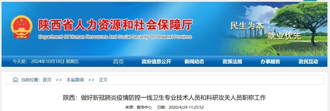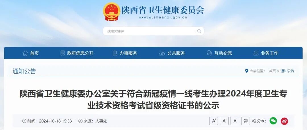10月18日,陕西省卫生健康委员会官网发布了《关于符合新冠疫情一线考生办理2024年度卫生专业技术资格考试省级资格证书的公示》。