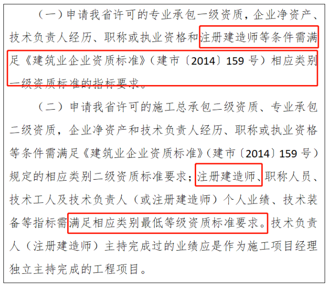 申请我省许可的施工总承包二级资质、专业承包二级资质,企业净资产和技术负责人经历、职称或执业资格等条件需满足《建筑业企业资质标准》(建市〔2014〕159号)规定的相应类别二级资质标准要求;注册建造师、职称人员、技术工人及技术负责人(或注册建造师)个人业绩、技术装备等指标需满足相应类别最低等级资质标准要求。技术负责人(注册建造师)主持完成过的业绩应是作为施工项目经理独立主持完成的工程项目。