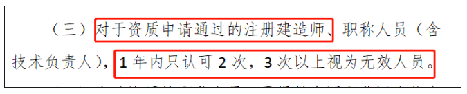 对于资质申请通过的注册建造师、职称人员(含技术负责人),1年内只认可2次,3次以上视为无效人员。