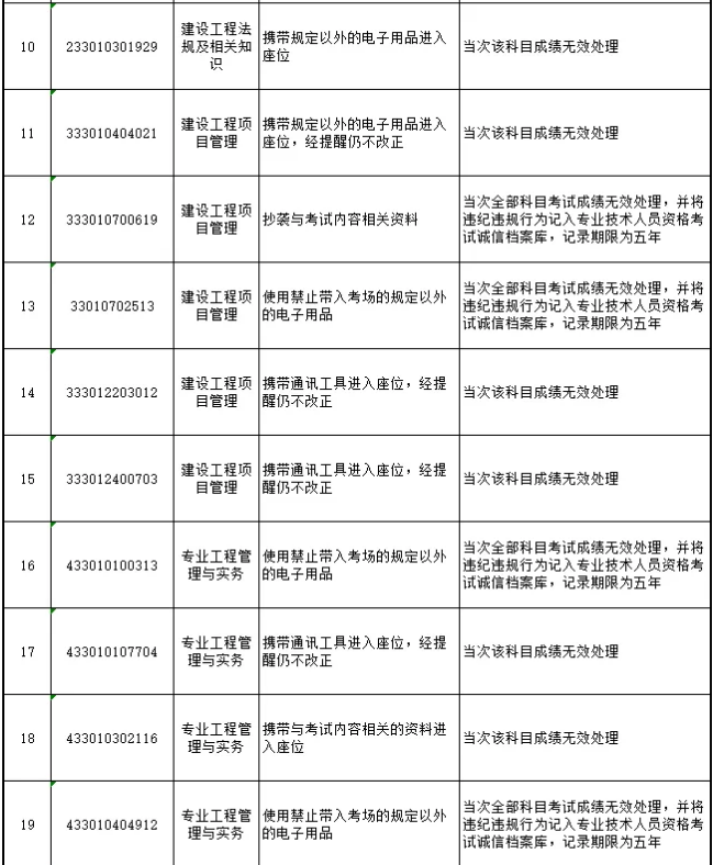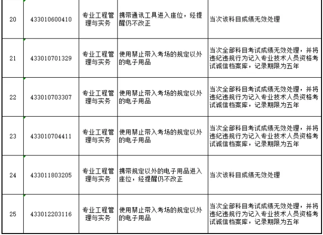 其中18人当次该科目成绩无效处理,8人当次全部科目考试成绩无效处理,并将其违纪违规行为记入专业技术人员资格考试诚信档案库,记录期限为五年。