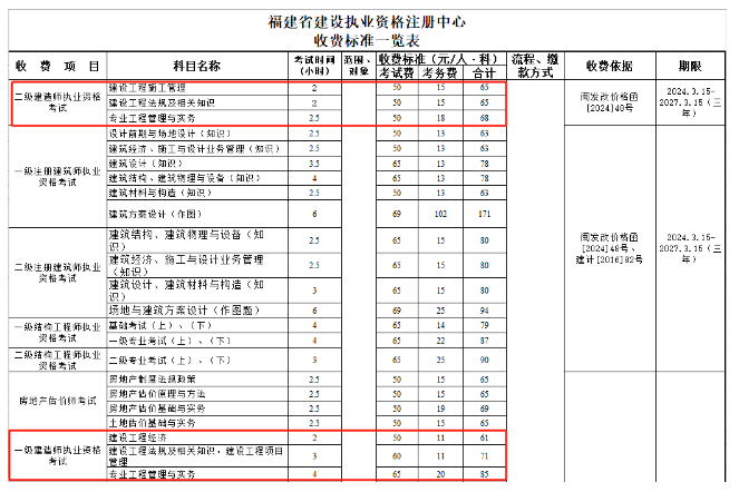 2024年12月05日 来源:来学网近日,福建省住房和城乡建设厅网站公布了《福建省建设执业资格注册中心收费标准一览表》。