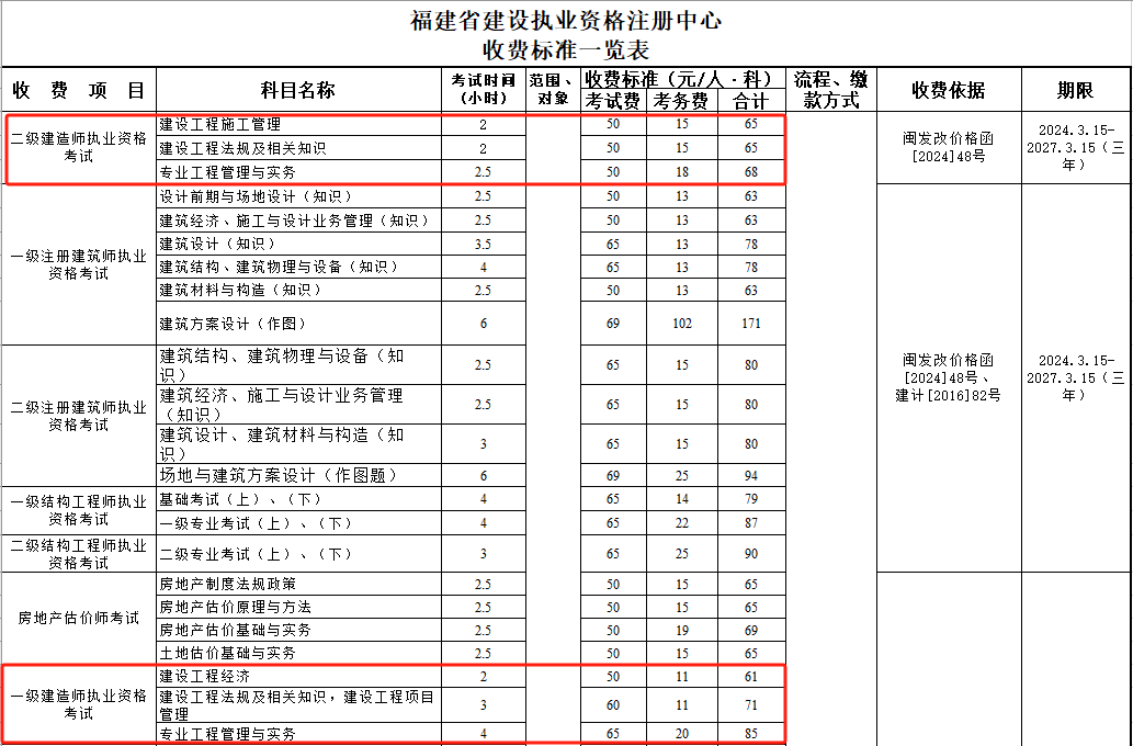 2024年12月05日 来源:来学网近日,福建省住房和城乡建设厅网站公布了《福建省建设执业资格注册中心收费标准一览表》。