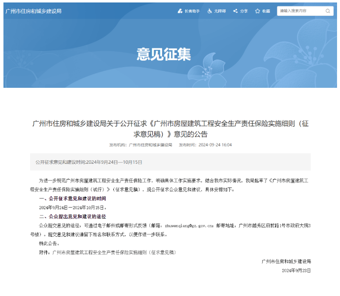 根据公告,为贯彻落实相关法律法规的要求,切实发挥保险风险保障和风险管控作用,提升全市房屋建筑工程领域安 全生产管理水平,特意制订了《广州市房屋建筑工程安 全生产责任保险实施细则(征求意见稿)》。