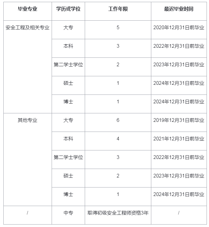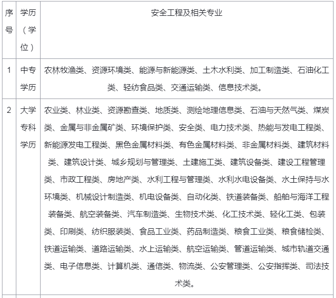 2、具有安全工程及相关专业大学本科学历,从事安全生产业务满3年;或具有其他专业大学本科学历,从事安全生产业务满4年。