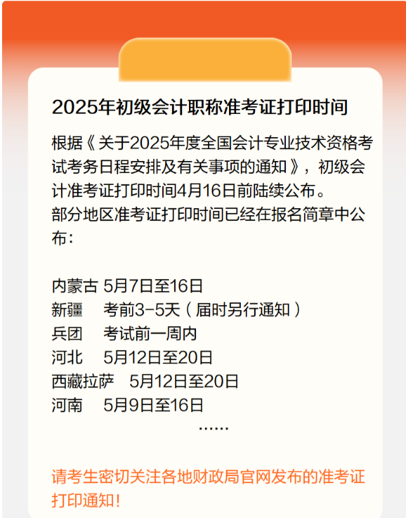 根据《关于2025年度全国会计专业技术资格考试考务日程安排及有关事项的通知》,4月16日前,各省级考试管理机构公布本地区初级、高级会计资格考试准考证网上打印起止时间。