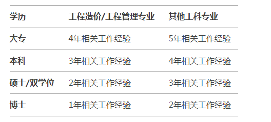 若你是 工程造价专业本科,只需 3年 工作经验,而其他工科需 4年。