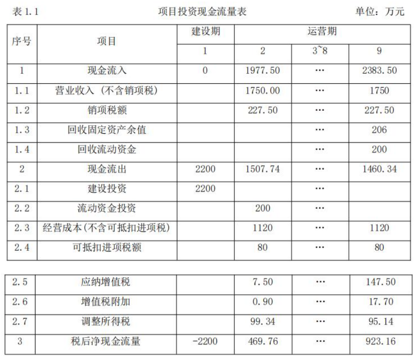 1.项目建设投资2200万元(含可抵扣进项税140万元),项目建设期1年,运营期8年,建设投资全部形成固定资产,固定资产使用年限8年,残值率10%,按直线法折旧。