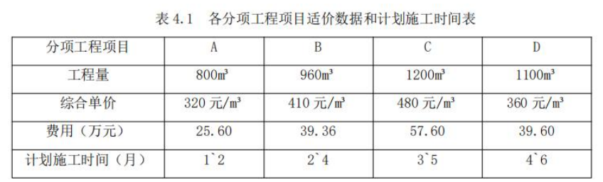 1.分项工程(含单价措施,下同)项目4项,总费用162.16万元,各分项工程项目造价数据和计划施工时间见表4.1。