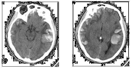 患者男性,62岁。 因“摔伤后头痛、烦躁3小时”来诊。 入院时查体:体温 37.2℃,血压 140/85 mmHg(1 mmHg=0.133 kPa),心率 106次/分,呼吸28次/分,意识蒙眬,躁动不安,胡言乱语,格拉斯哥昏迷指数评分(GCS) E3+V3+M5=11分,后枕部头皮青紫肿胀,双侧瞳孔等大等圆,直径3 mm,对光反射存在,颈稍抵抗,双肺呼吸音稍粗,四肢肌力、肌张力正常,双侧巴宾斯基征阴性。提示:对该患者进行颅脑CT扫描检查,CT结果如下图;血常规结果回报:白细胞计数13×1012/L、中性粒细胞比值0.72、Hb 102 g/L;电解质结果:Na+131 mmol/L、K+3.5 mmol/L;凝血功能各项指标在正常范围内;血清白蛋白28 g/L。