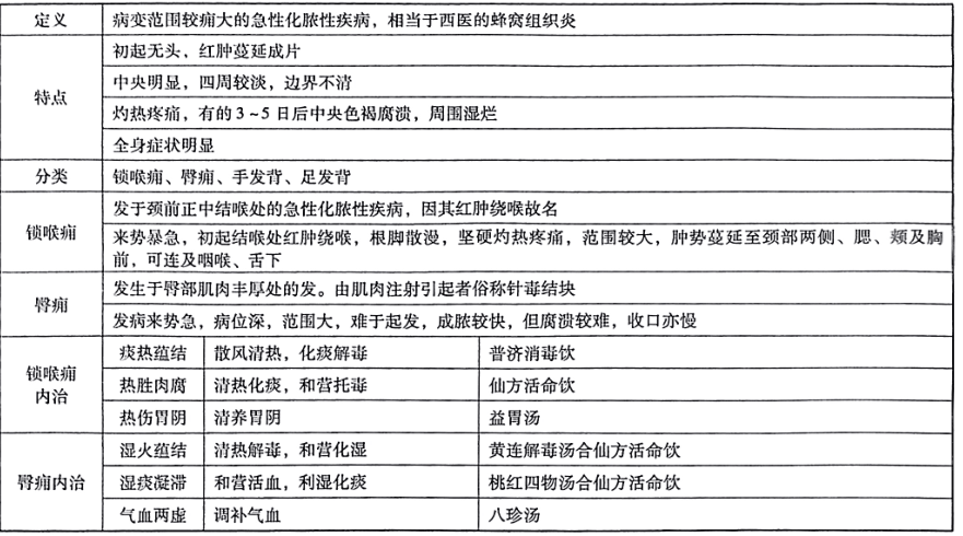 臀痈痰湿凝滞证:1.证候:漫肿不红,结块坚硬,病情进展缓慢,多无全身症状。舌苔薄白或白腻,脉缓。2.治法:和营活血,利湿化痰。3.选方:桃红四物汤合仙方活命饮加减。【考点】发: